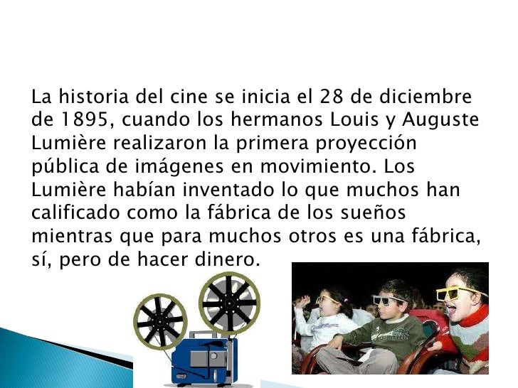 - 3. La historia del cine se inicia el 28 de diciembre de 1895, cuando los hermanos Louis y Auguste Lumière realizaron la primera proyección pública de imágenes en movimiento. Los Lumière habían inventado lo que muchos han calificado como la fábrica de los sueños mientras que para muchos otros es una fábrica, sí, pero de hacer dinero.<br />