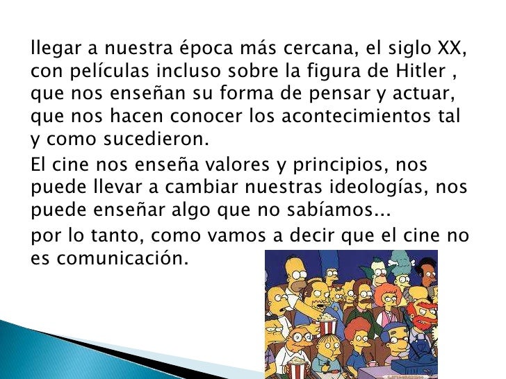 - 8. llegar a nuestra época más cercana, el siglo XX, con películas incluso sobre la figura de Hitler , que nos enseñan su forma de pensar y actuar, que nos hacen conocer los acontecimientos tal y como sucedieron. El cine nos enseña valores y principios, nos puede llevar a cambiar nuestras ideologías, nos puede enseñar algo que no sabíamos... <br />por lo tanto, como vamos a decir que el cine no es comunicación.